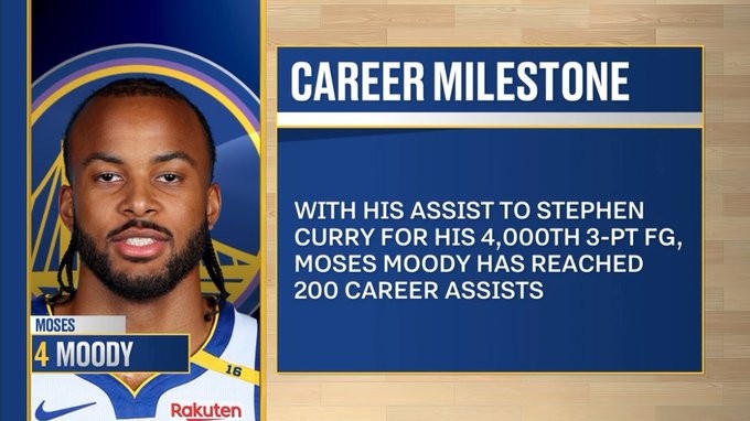比赛第三节,穆迪助攻库里命中本场第2记三分,后者正式突破4000记三分神级大关,而这也是穆迪生涯的第200次助攻!