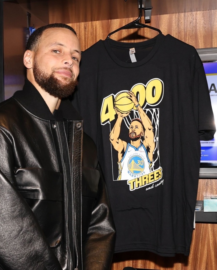 赛后NBA官推晒出了库里穿皮衣与4000三分T恤合照,并写道:Mr.4K(4000三分先生)!