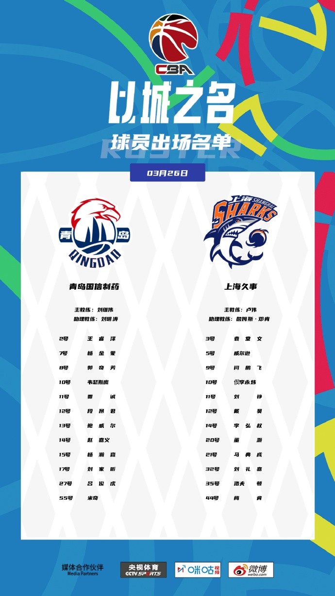 3月26日讯 今晚7点35分,青岛男篮将在主场迎战上海男篮。