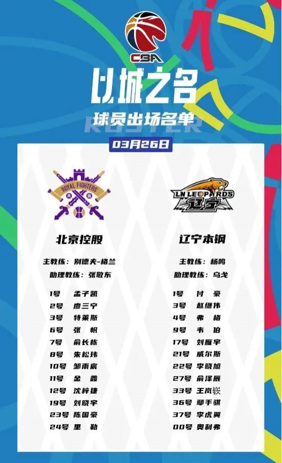 北控:孟子凯、廖三宁、特莱斯、张帆、俞长栋、朱松玮、邹雨宸、金鑫、沈梓捷、刘晓宇、陈国豪、里勒。