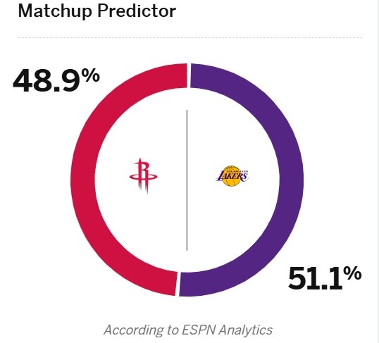 今天,ESPN预测本场比赛胜率,湖人51.1%略占优势,火箭(背靠背第二战)48.9%。