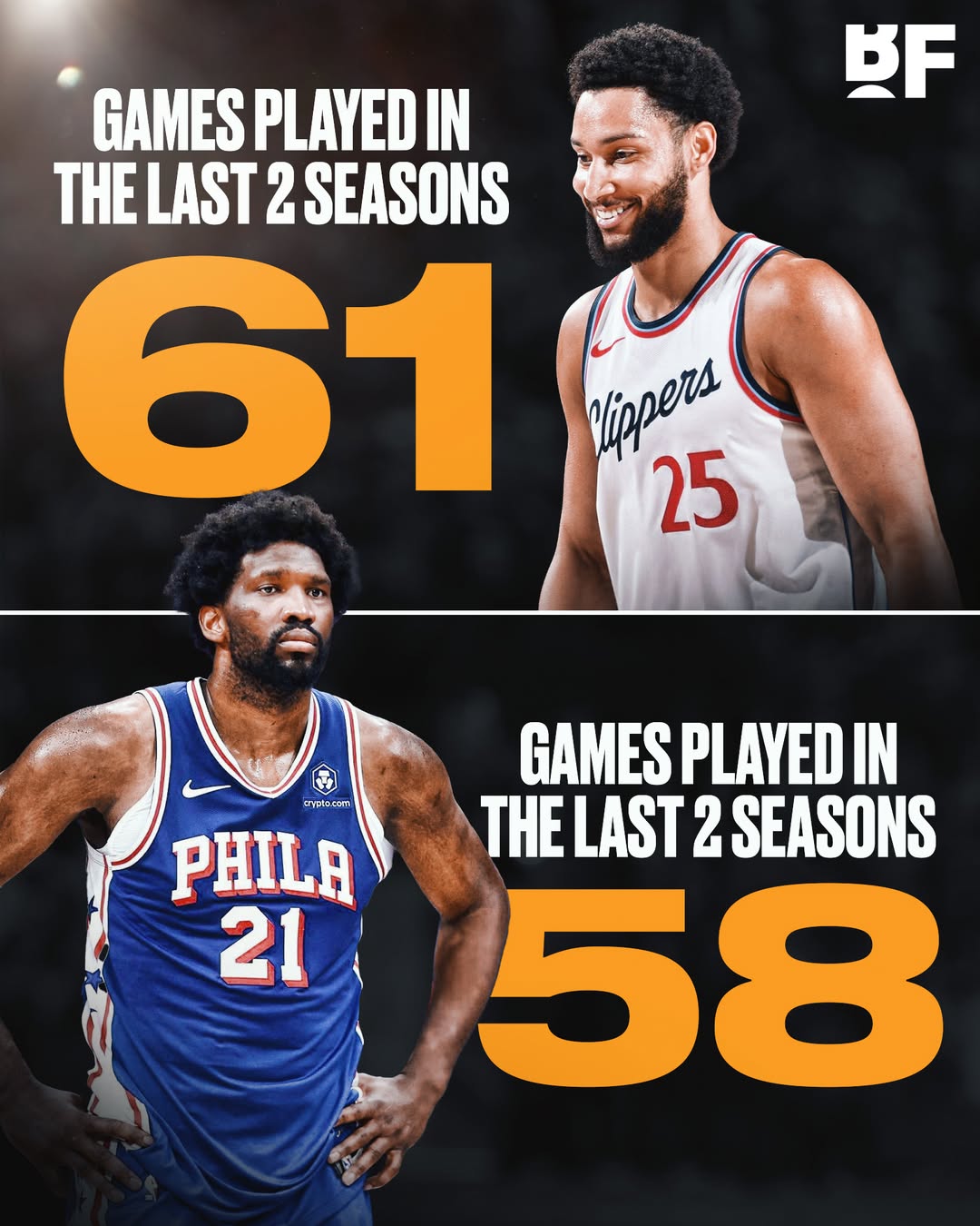 扎心了西蒙斯过去两个赛季打了61场比赛>恩比德的58场