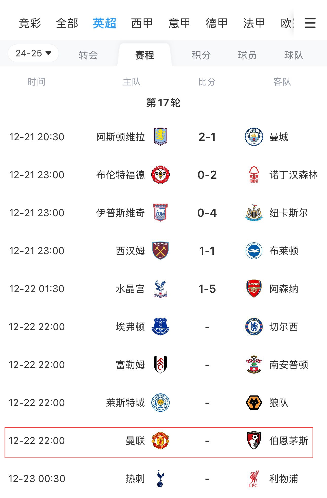 2024年12月21日 12月21日 英超第17轮 阿斯顿维拉vs曼城 进球