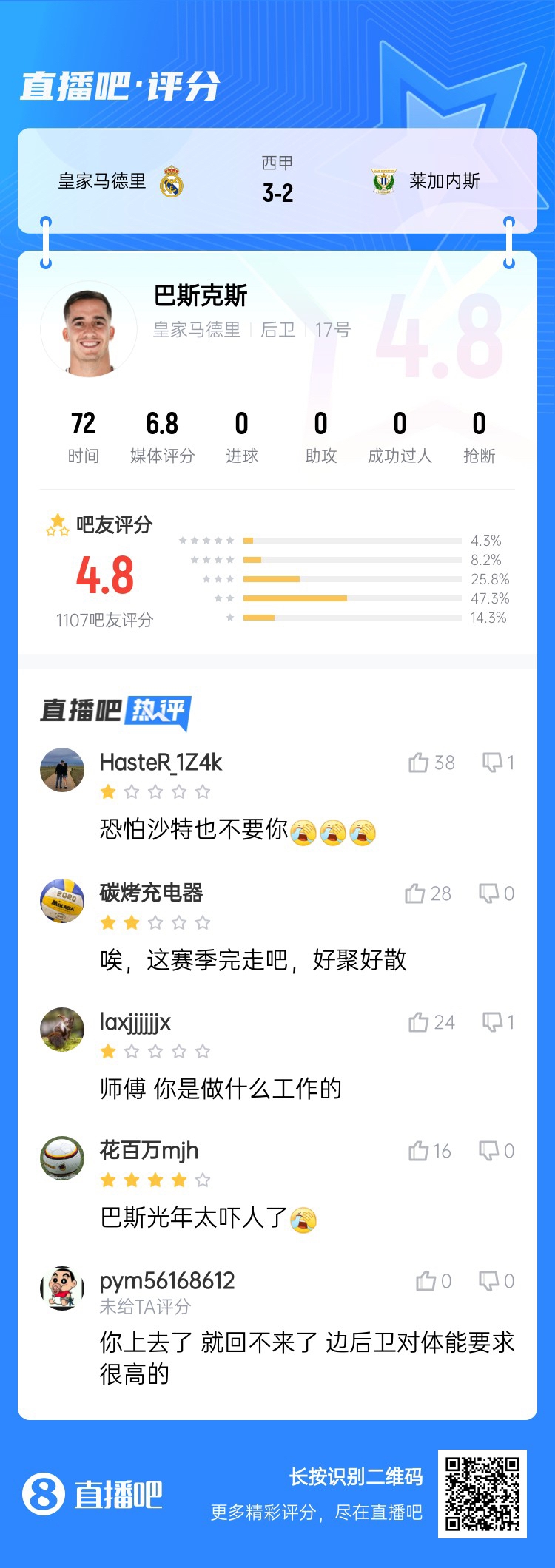 03月30日讯 皇马3-2战胜莱加内斯,首发右后卫巴斯克斯表现不佳。