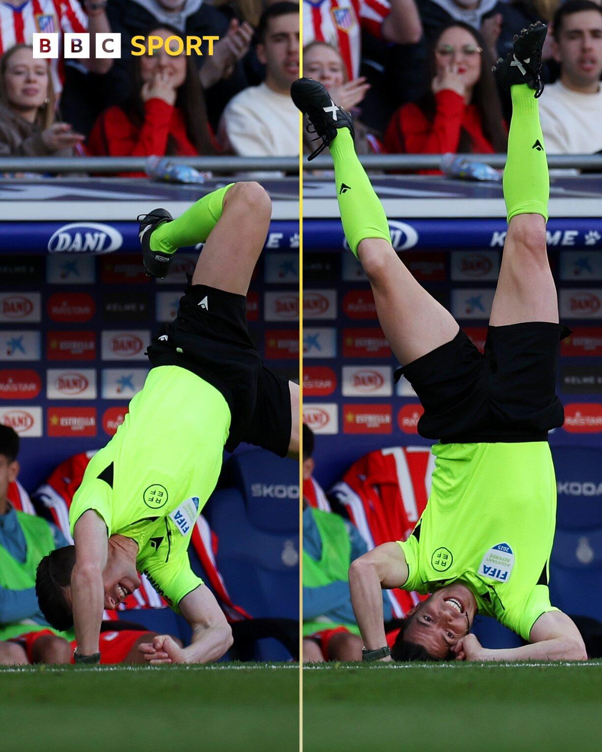 这就是街舞小西蒙尼想边路超车撞上边裁,后者摔了个倒栽葱