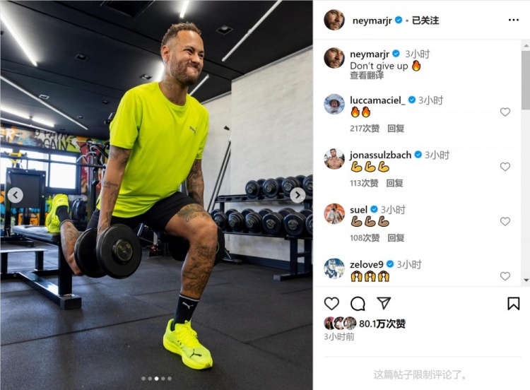内马尔因伤缺席巴西国家队3月份的比赛,他在社交媒体上晒出健身房内的照片,配文:“不要放弃